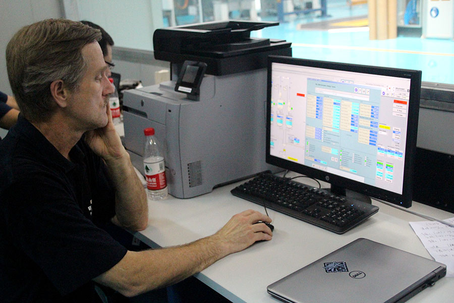 浪莎集團董事長翁榮金、總裁翁榮弟、總經理翁關榮和藍也薄膜董事長翁曉鋒一同啟動設備