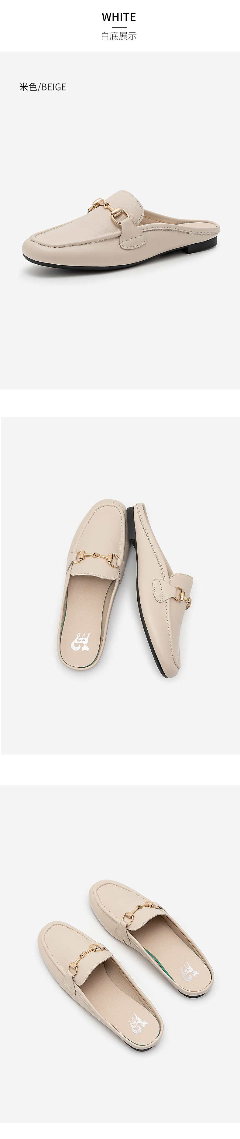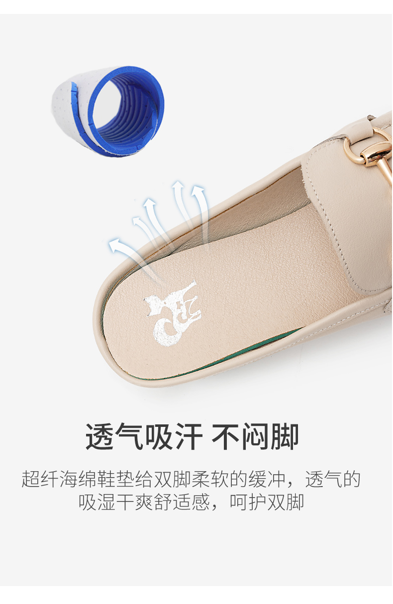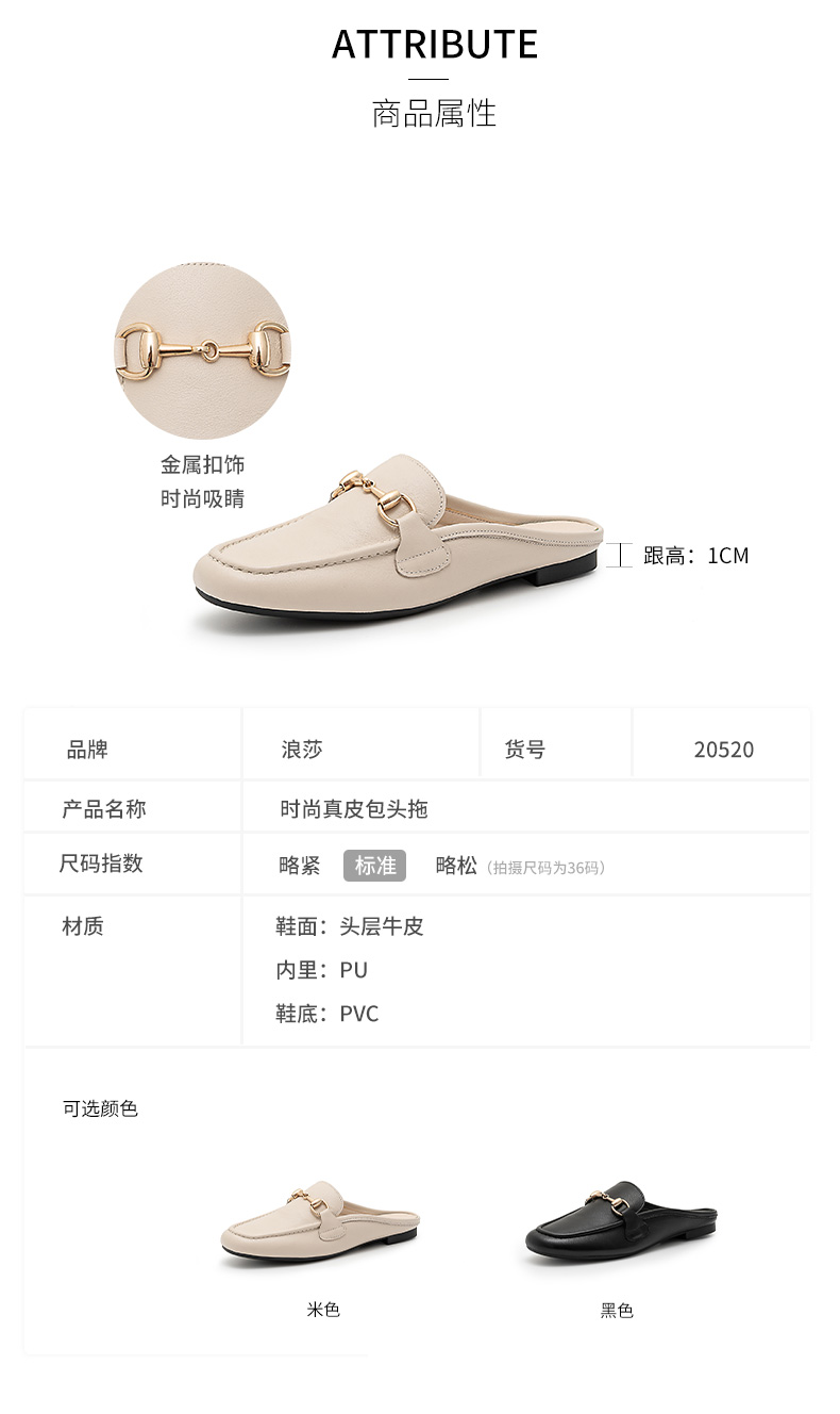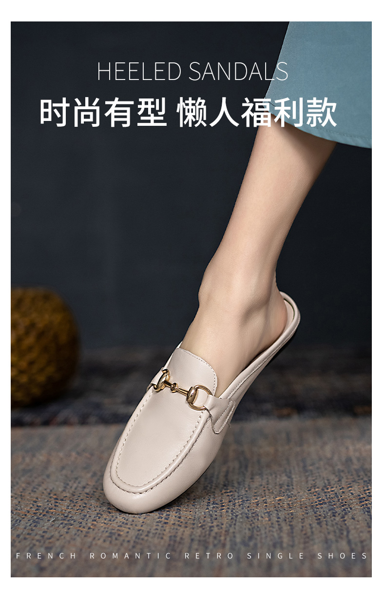 浪莎包頭拖鞋女夏外穿2021春真皮平底半拖鞋粗跟圓頭搭扣穆勒涼拖